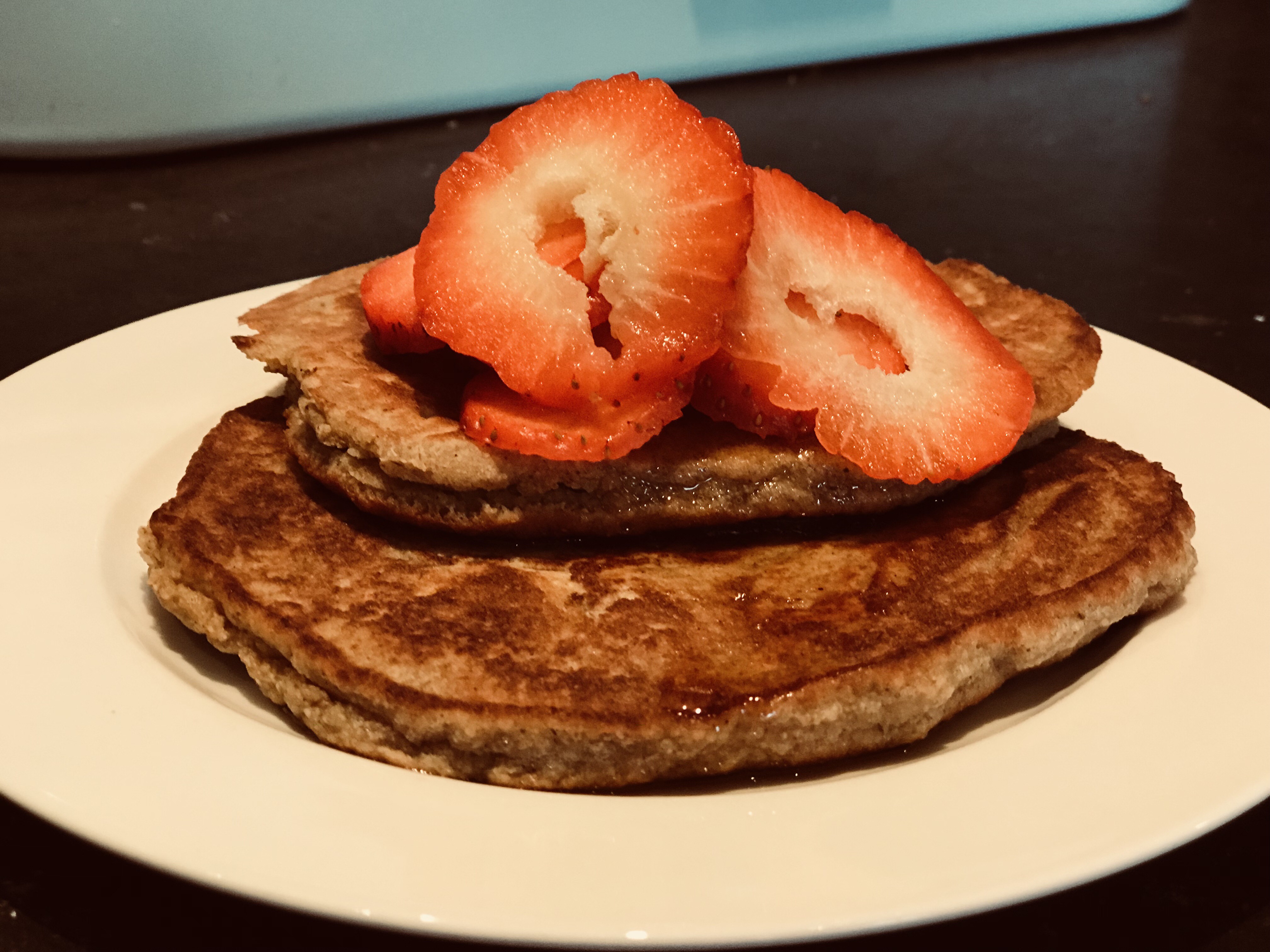 A ripe banana, two eggs, some flour, some vanilla or cinammon et voila….